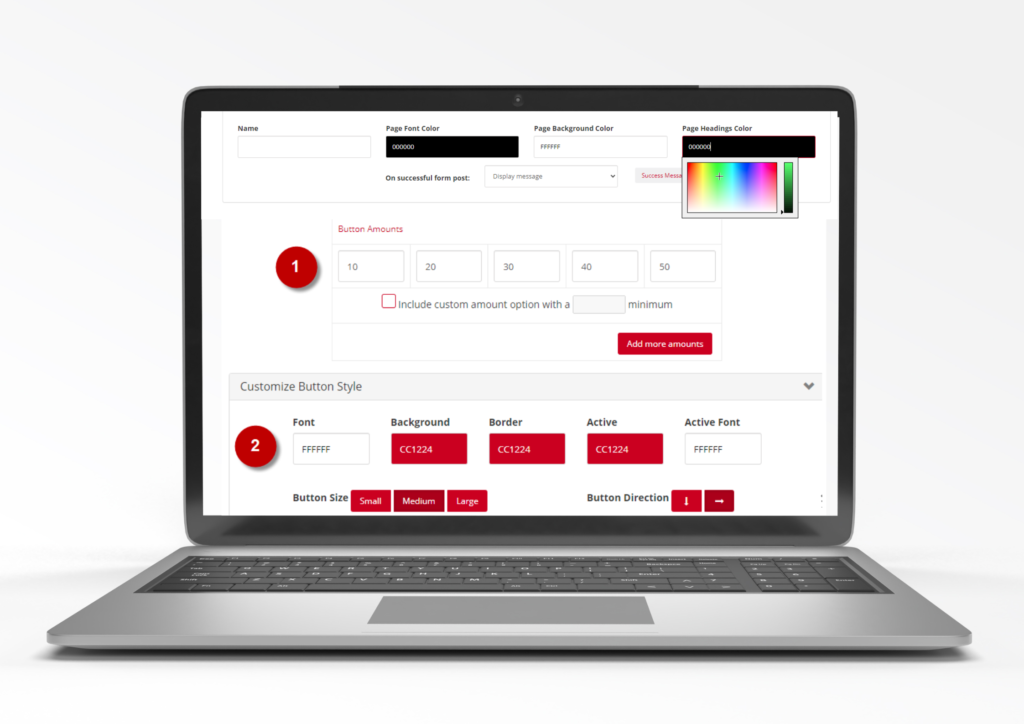 Lastly, you will set the donation amount buttons. You also have the ability to create a custom amount option. The default setup is 10, 20, 30, 40, and 50 dollar amounts. If you would like to change the dollar amounts, simply edit the default values or add a text box. To customize the buttons, first use the color wheel, then select the size. Below is a preview of what the widget setup looks like: